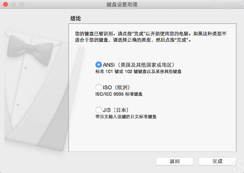 如果系统没有自动弹出提示,也可以通过“系统偏好设置”—“键盘”—“更改键盘键盘类型”来进行识别。识别之后,系统会将键盘上的Windows映射成苹果键,alt键映射成option键。