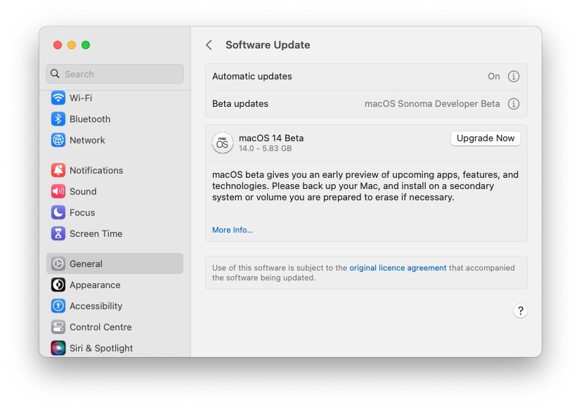 Apple从macOS Ventura 13.4开始更改了向Beta提供更新的方式。如果您尚未采用该版本的macOS,将需要下载macOS开发者版Beta访问工具或macOS公共版Beta访问工具以获取Beta版本。
