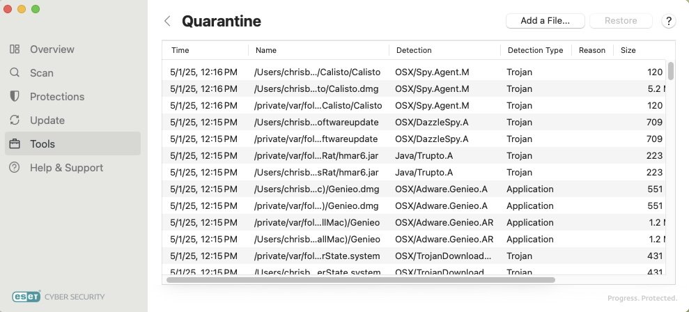 在涉及实际病毒和恶意软件保护的情况下,这方面的表现是优差参半,但软件依然表现不错。在macOS的GateKeeper功能和ESET的安全层之间,我们尝试安装的恶意软件并不多,而ESET的初步扫描能够准确识别并隔离可疑文件。