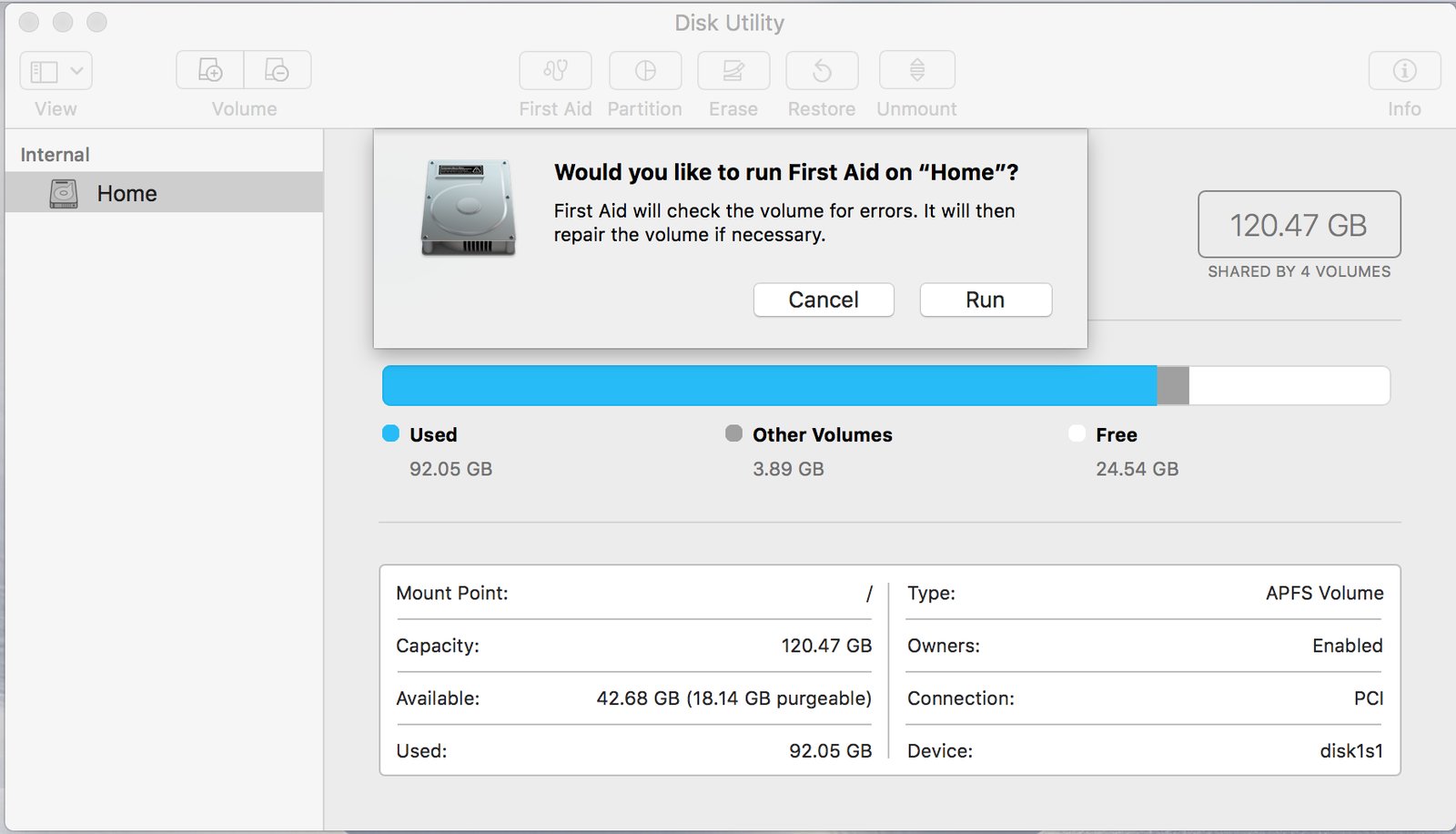 你将看到一条消息,指出First Aid会检查卷中的错误。如果有必要的话,该过程将修复卷。