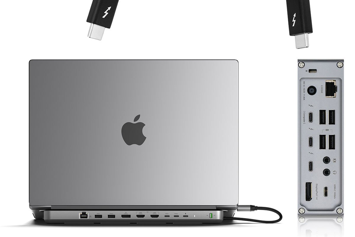 这款旗舰产品配备三个80Gbps雷电5接口(1上联2下联)、十个10Gbps USB接口(5A+5C)、万兆以太网、高速读卡器和前后音频接口,330W电源适配器可同时满负荷运行所有接口。