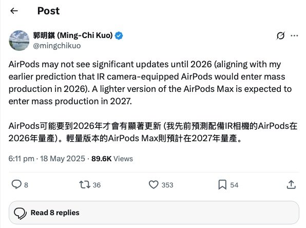 然而2025年5月,分析师郭明錤暗示更新可能推迟至2026年,这与苹果计划为AirPods配备新型红外摄像头导致的生产延迟有关(下文详述)。