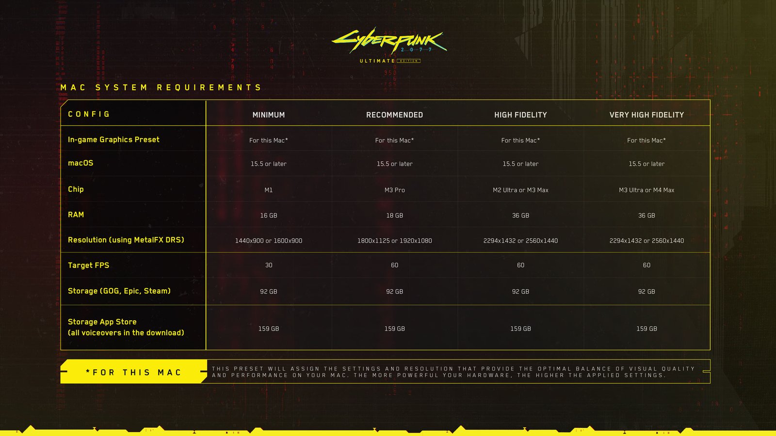 CD Projekt Red团队此前已为《巫师1&2》推出Apple Silicon适配更新,本次《赛博朋克2077》Mac版同样完成出色。官方称基础款M1芯片即可运行——但需要macOS 15.5系统及16GB内存(且不兼容Intel芯片Mac)。
