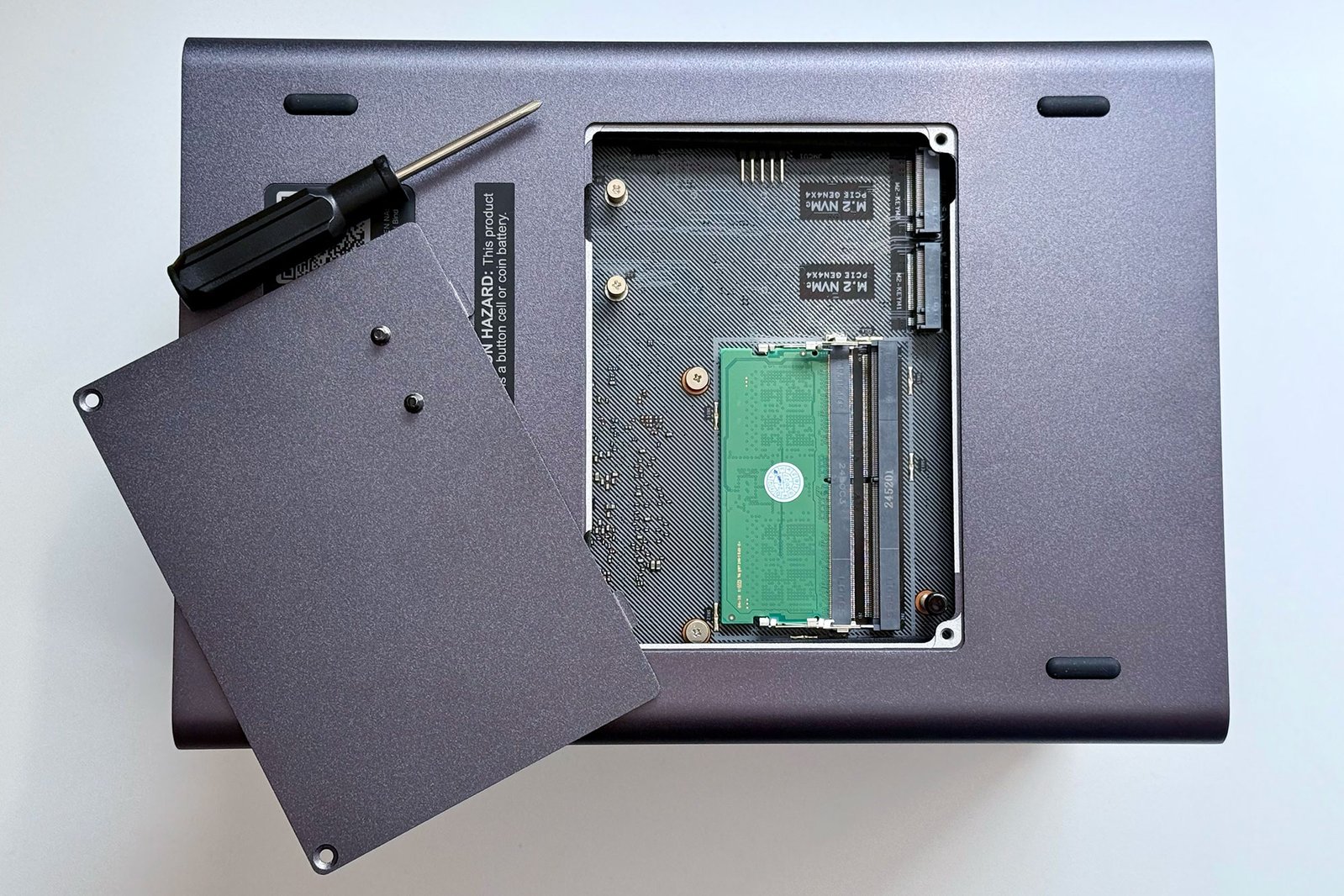 DXP4800系列的SSD插槽位于底部盖板下(需使用附赠螺丝刀),比DXP2800的侧置设计更易操作。后置散热风扇配有磁吸防尘网。