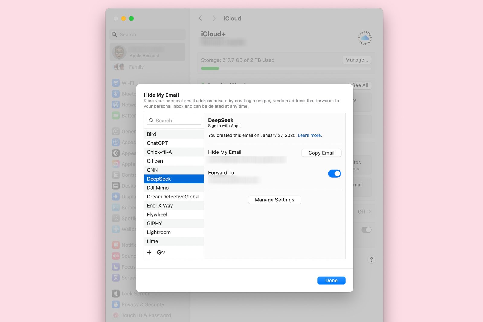 您可在设置 > Apple账户 > iCloud > 隐藏邮件中管理所有别名地址,随时关闭邮件转发或删除账户关联。