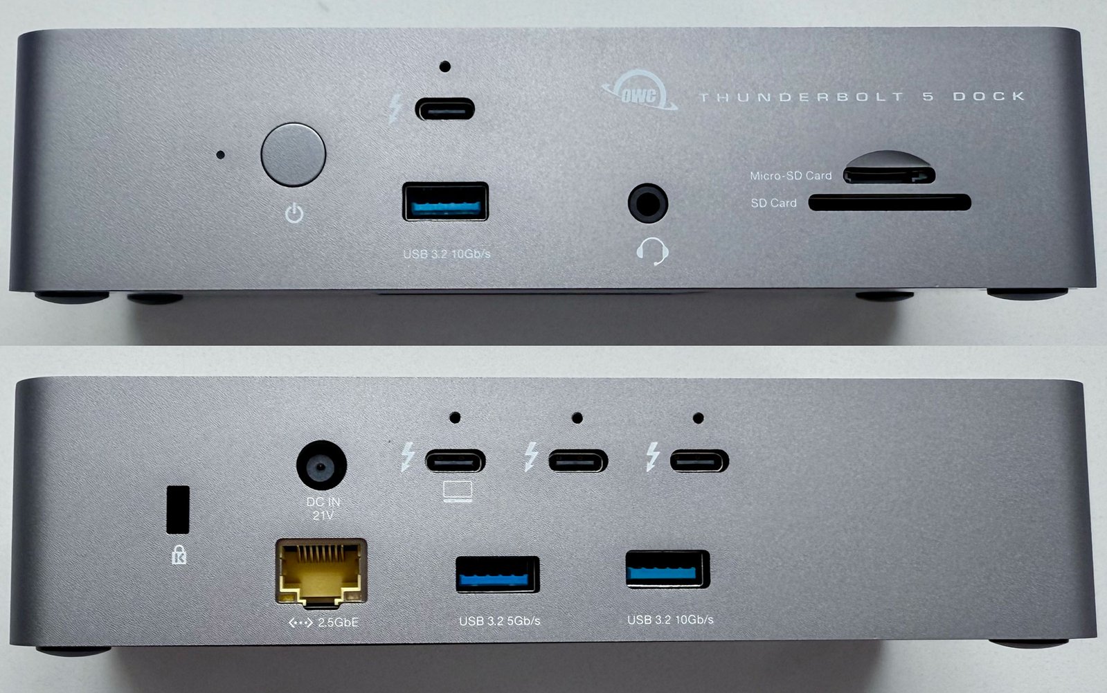 OWC Thunderbolt 5集线器(上)与扩展坞(下)前端接口对比