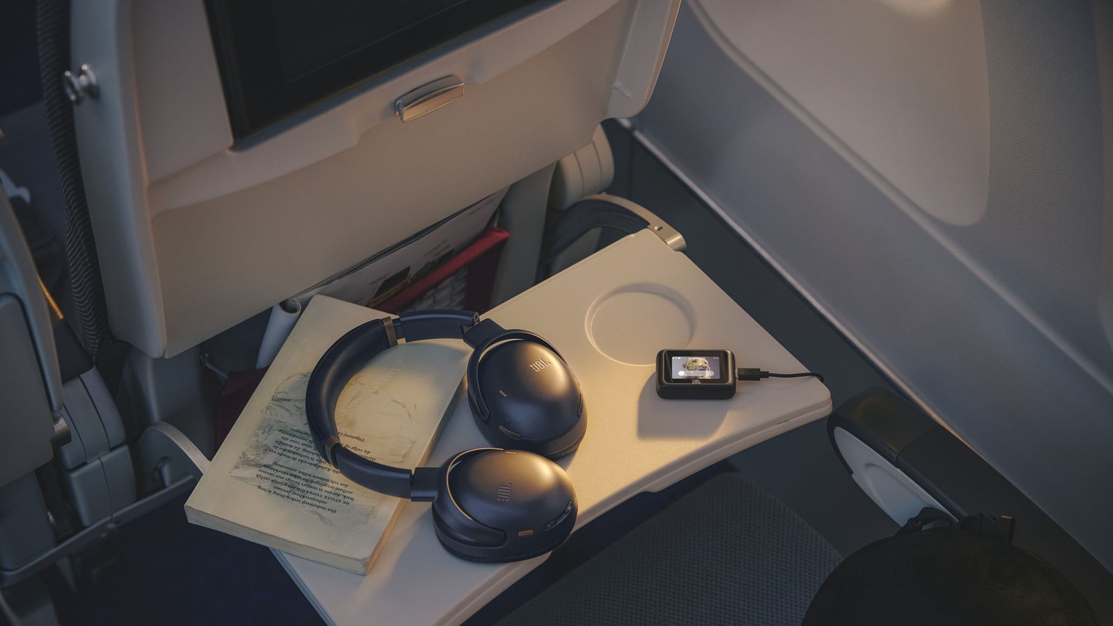 蓝牙模式下可通过JBL应用的10段EQ调节音效,专属Personi-fi功能还能通过频响测试定制个性化听感。智能发射器则专为有线音源设计,配备触控LCD屏可调节音量/降噪等参数,双USB-C接口(音频/供电分离)兼容各类设备,随机附赠3.5mm/USB-C线材及USB-A转接头,夜间飞行时甚至可调高屏幕亮度充当简易照明。