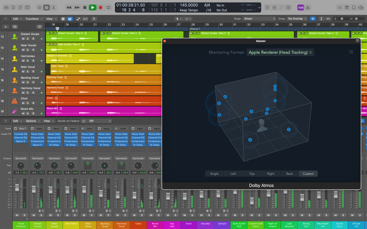 空间音频制作能力使Logic Pro 11.2.2走在了沉浸式音频创作的前沿。完整的杜比全景声(Dolby Atmos)工具集允许用户在三维空间中定位和移动声音元素,创作符合Apple Music要求的空间音频作品。 Mastering Assistant功能则简化了母带处理流程,帮助用户快速获得商业级响度和音质的最终混音。