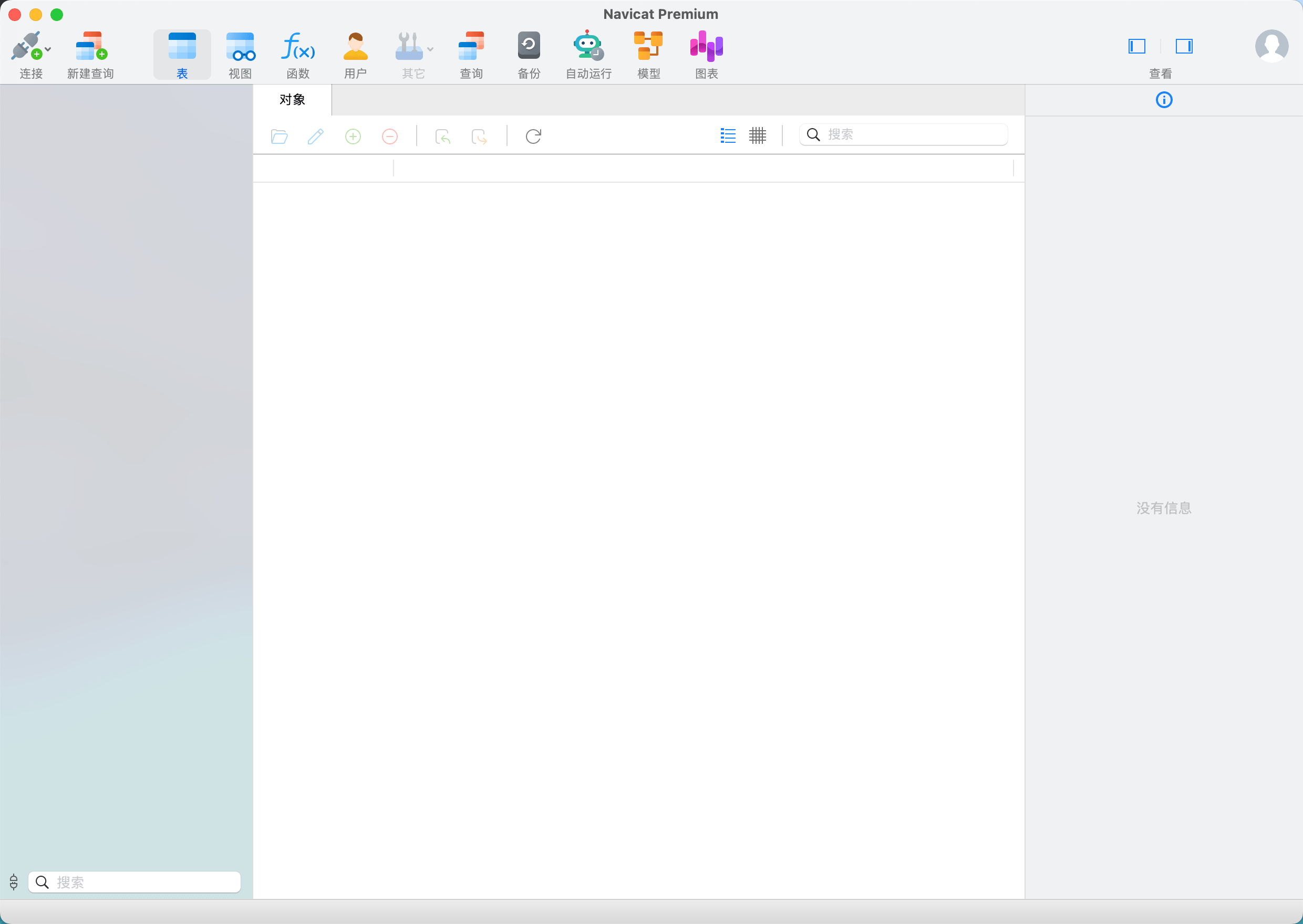 Navicat Premium 17.2.9 for Mac的用户界面经过重新设计,遵循了macOS的人机界面指南,同时保持了Navicat系列的操作逻辑一致性。整体布局采用标准的三栏式结构:左侧为连接导航树,中间为主要工作区,右侧为属性面板。这种布局既保证了信息密度,又确保了操作效率。