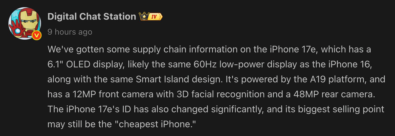最新爆料来自以准确预测著称的数码博主"数码闲聊站",其在微博透露了iPhone 17e的细节。据悉,这款手机将更接近高端机型设计,主要变化是可能采用灵动岛替代iPhone 16e的刘海屏。该博主还表示,新机将保留6.1英寸60Hz OLED屏幕、1200万像素前摄和4800万像素后摄配置。
