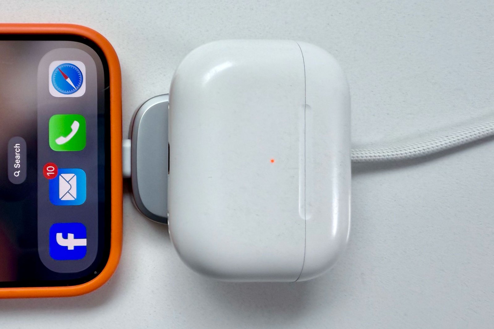 这根1.5米长的线缆两端都是标准USB-C接口,但其中一端内置了一个无线充电盘。这可以用来为任何苹果手表或支持无线充电的AirPods充电盒(AirPods Pro 2或AirPods 4 ANC)充电。