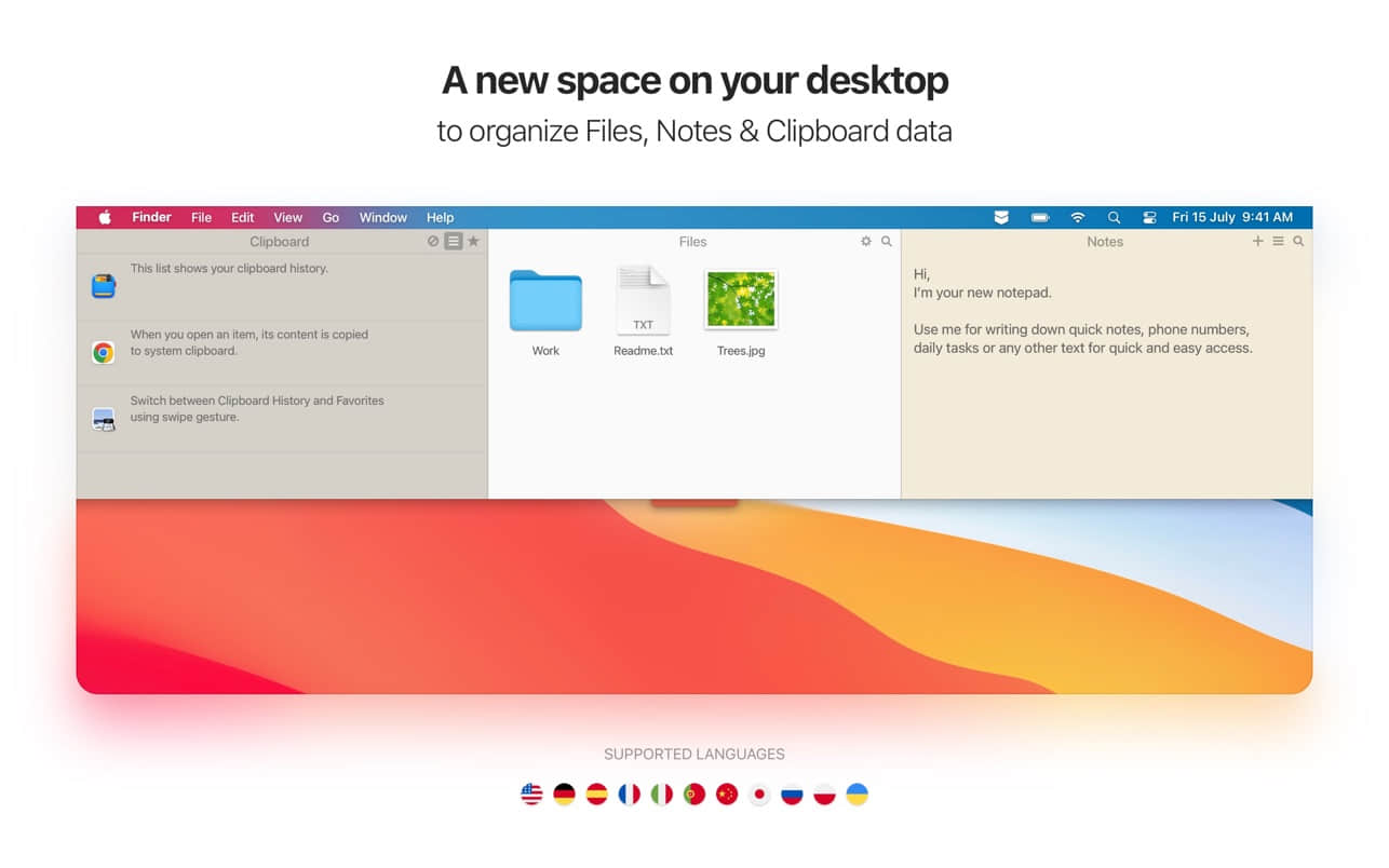 Unclutter 并非传统意义上的文件管理工具。它将自己隐藏在屏幕顶端边缘的一个狭长区域中,等待用户的下拉手势唤醒。一旦触发,它会展开一个三合一面板:文件暂存区、剪贴板历史记录和笔记编辑器。这种设计源于对效率工作流的重新思考——将碎片化操作集中在一处,减少窗口切换带来的注意力分散。