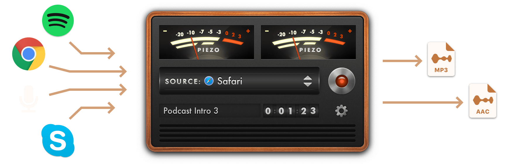 Piezo 支持一键录制来自任意应用的系统音频(如浏览器、音乐播放器)或外接麦克风输入。用户可通过拖拽式界面选择音源,并直接保存为 AAC、AIFF、MP3 等格式。其后台静默录制功能允许在关闭界面时持续捕获音频,同时提供自动音质匹配和元数据标记功能。