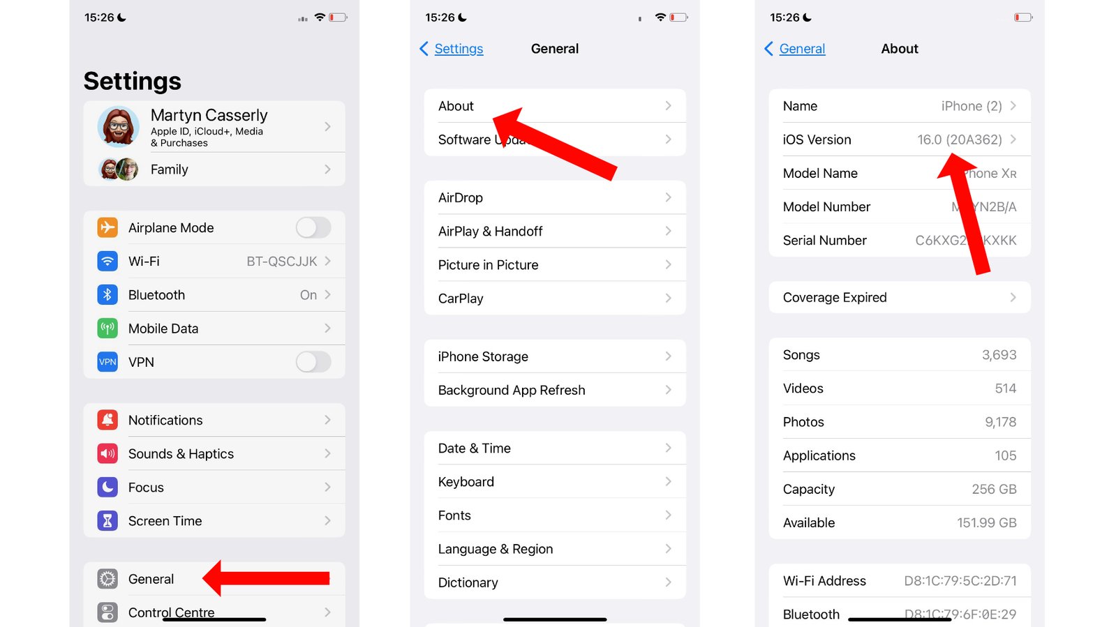 若不确定当前使用的 iOS 版本,查询方法非常简单:只需前往“设置”>“通用”>“关于本机”,找到“iOS 版本”即可。iPadOS 的查看步骤相同。