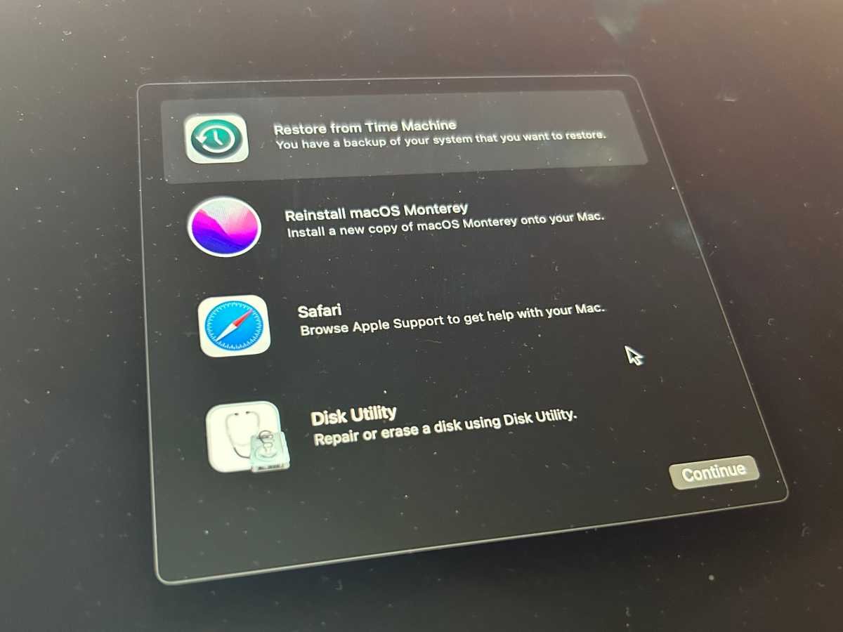 - 当选项出现在屏幕上时,选择“从时间机器备份恢复”并点击“继续”。