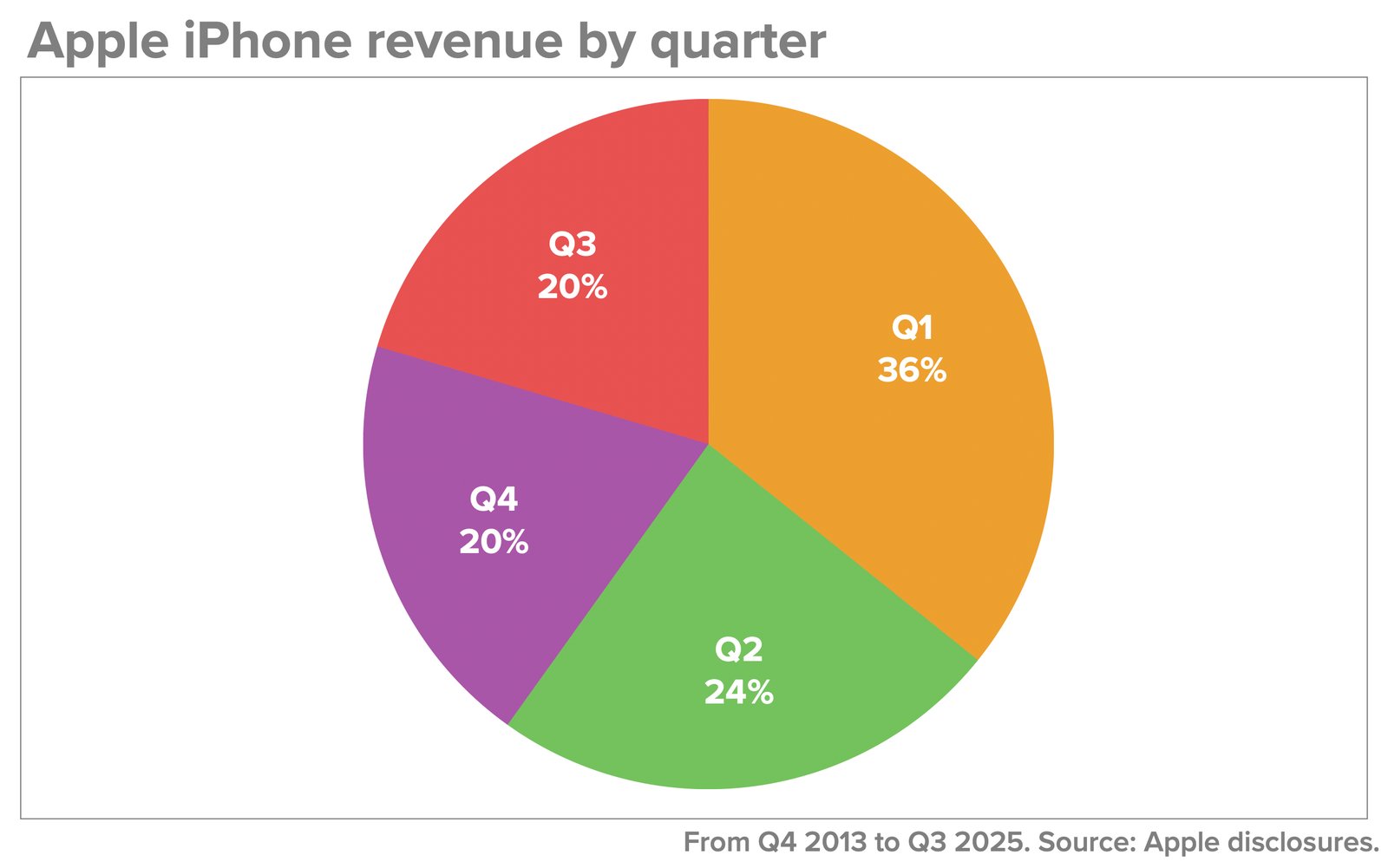 作为观察者,我们习惯将年末视为iPhone季。确实,公司第一财季总能创造36%的年销售额(需注意部分来自季度后期的节日消费,而非首发狂热)。