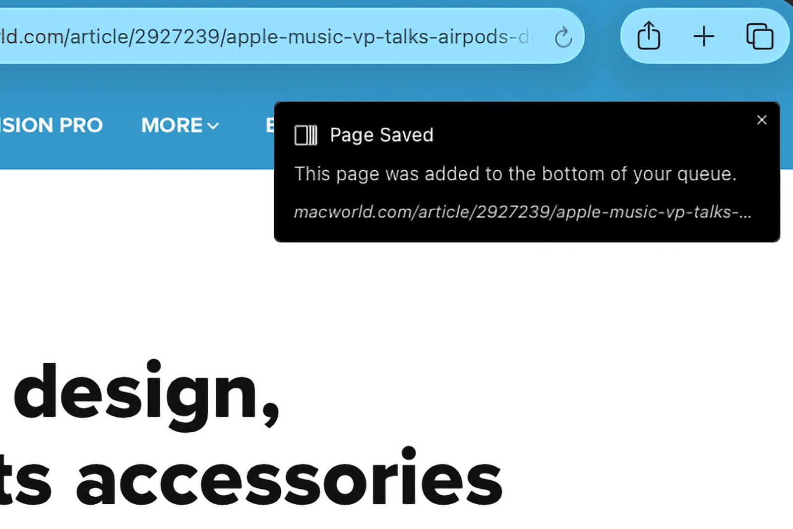 当你在Safari中点击Quiche Reader图标时,它会将文章的一个版本保存在Quiche Reader应用中,供以后阅读。