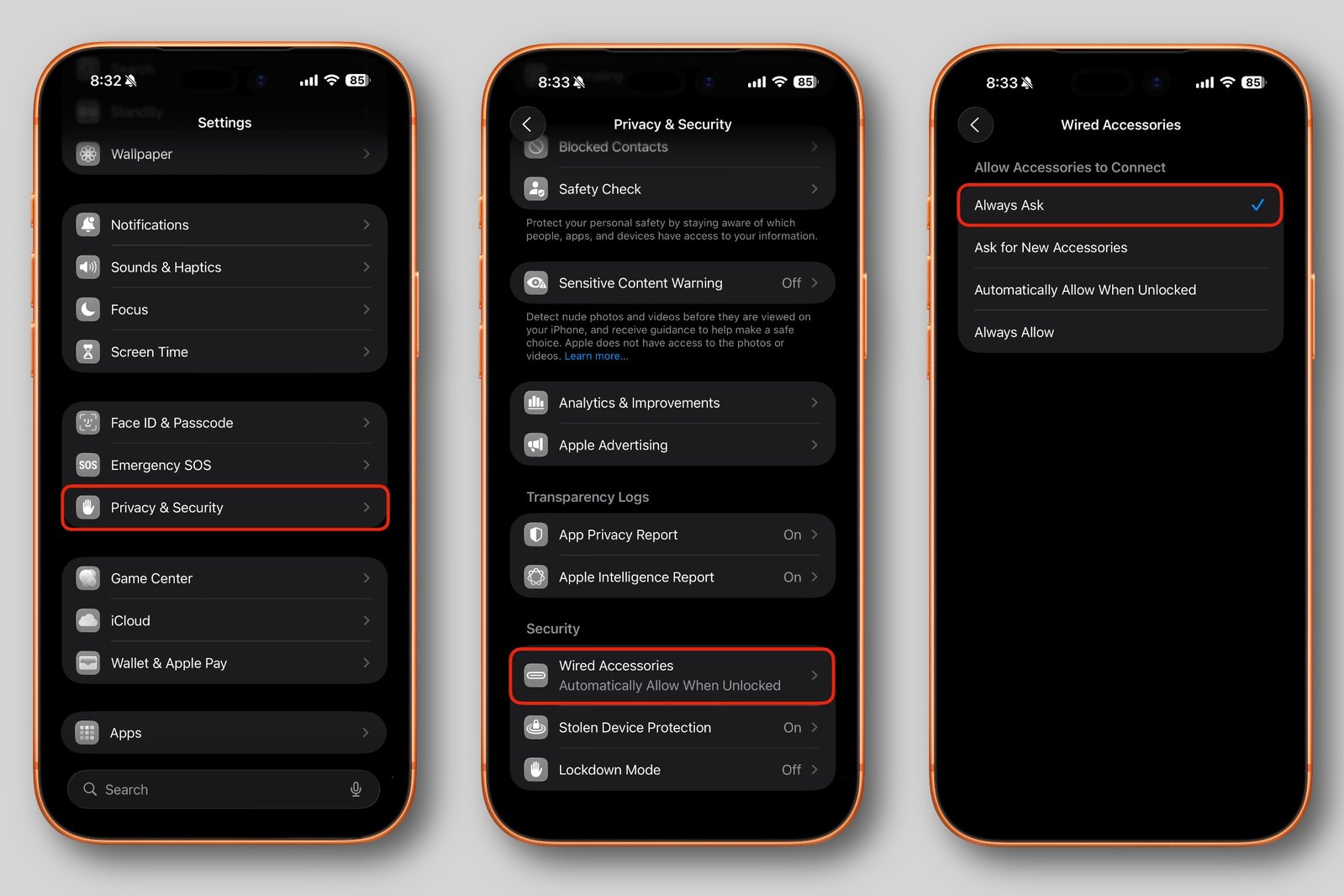 无论你个人如何评估这种风险,都有一个简单的补救措施(除了从不使用公共充电站之外)。在 iOS 26 和 iPadOS 26 中,苹果增加了一项在 Mac 上已经存在一段时间的功能:“有线配件”。你可能已经在 Mac 上见过这个功能,其默认设置是在你插入外部设备时询问你是否信任该设备。