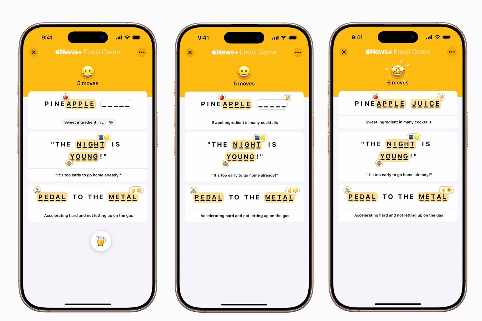 游戏概念很简单。每天有三个带有空白的短语,空白处对应一个基于表情符号的词语。每个短语有一个提示,但只部分显示,所以挑战是双重的:仅根据部分提示猜出整个短语,然后找出哪个表情符号序列能填补缺失的字母。满分是 6 分,每个错误答案或请求显示提示都会增加一分。