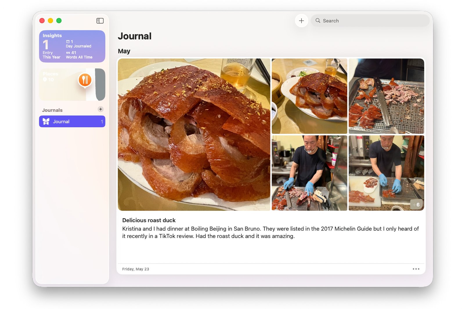 你现在可以在应用程序中创建多个日记,让你将生活的不同方面分开并有序组织。每个条目的布局可以通过照片、视频和其他附件来增强,还有一个地图视图,让你可以重新访问每个条目中提到的地点。由于能够在 Mac 上向日记添加内容,现在撰写较长的条目应该比之前只能在 iPhone 上尝试要舒适得多。这对于希望有一个地方定期记录想法的 Mac 用户来说,应该会使日记应用程序更加实用。