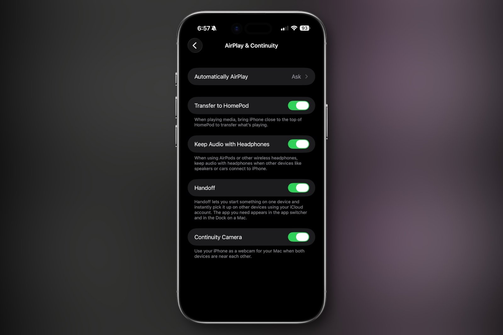 打开iPhone上的设置应用,进入通用 > 隔空播放与连续性。在新的"保持音频与耳机连接"选项下,你可以指定AirPods(或其他耳机)保持为首选播放设备,防止声音被其他连接到iPhone的无线设备劫持。