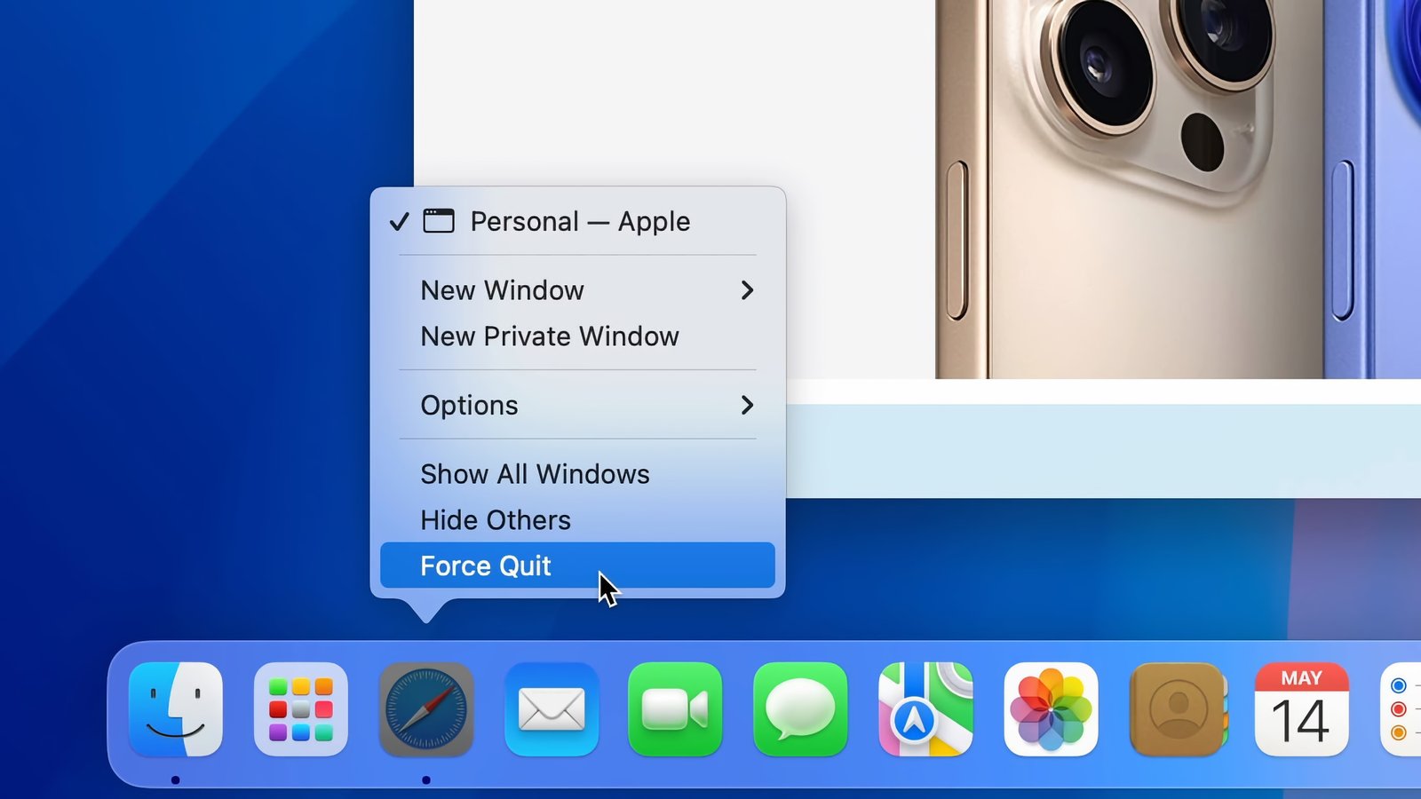 有应用冻结无响应了吗?不要等待它恢复正常服务,右键点击它在Mac程序坞中的图标,按住Option键,然后选择“强制退出”以立即关闭它。这个菜单项通常是隐藏的,但Option键会显示它。