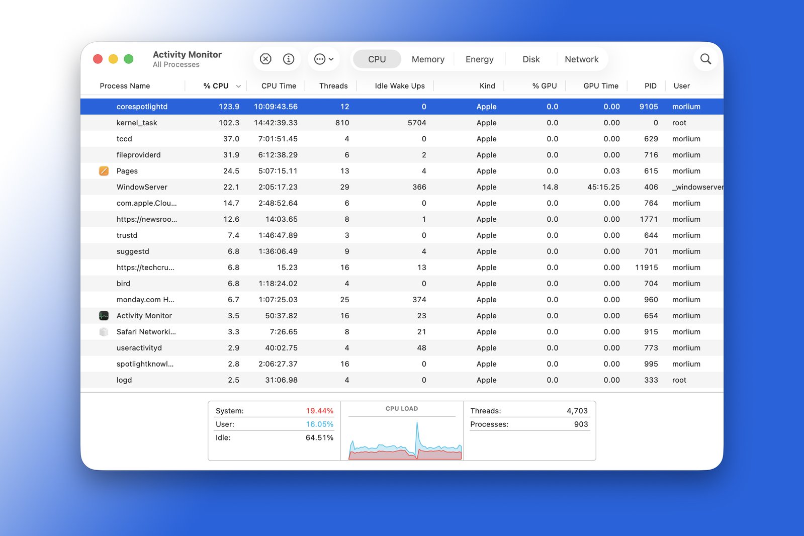 因此,在macOS 26.1未能解决问题后,我决定进一步调查。活动监视器中的一切似乎都正常,但我注意到CPU标签页有一个异常。虽然CPU负载图表没有显示任何持续性问题,但有两个进程——corespotlightd和kernel_task——经常占用超过100%的CPU。