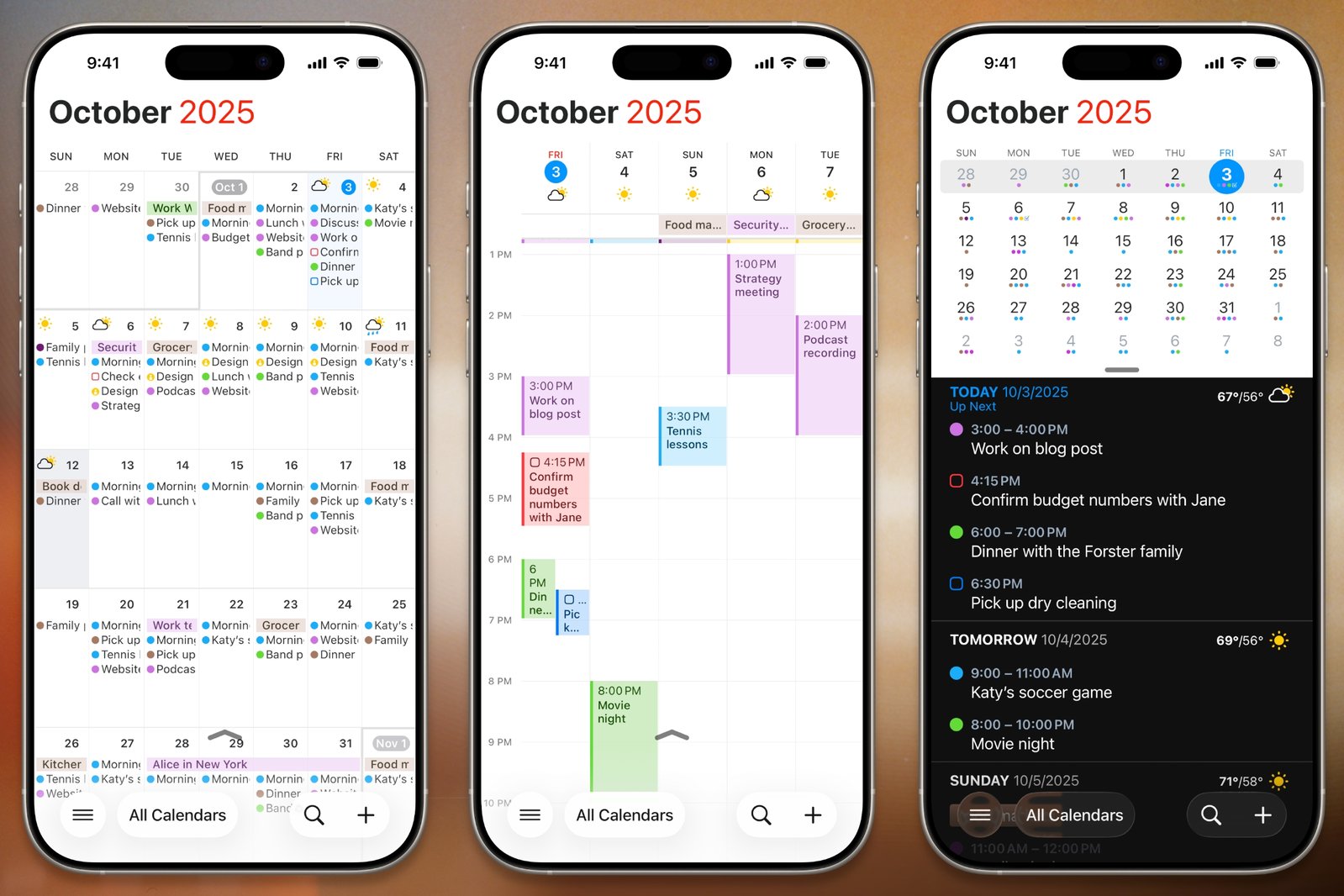 于是Fantastical登场了。这款应用长期以来一直是苹果粉丝的最爱,它添加了苹果默认应用所缺乏的丰富功能,从多种视图和自定义选项,到自然语言输入和每日快速天气指示。你还可以设置自己的日常可用性,并让他人预约你的时间。