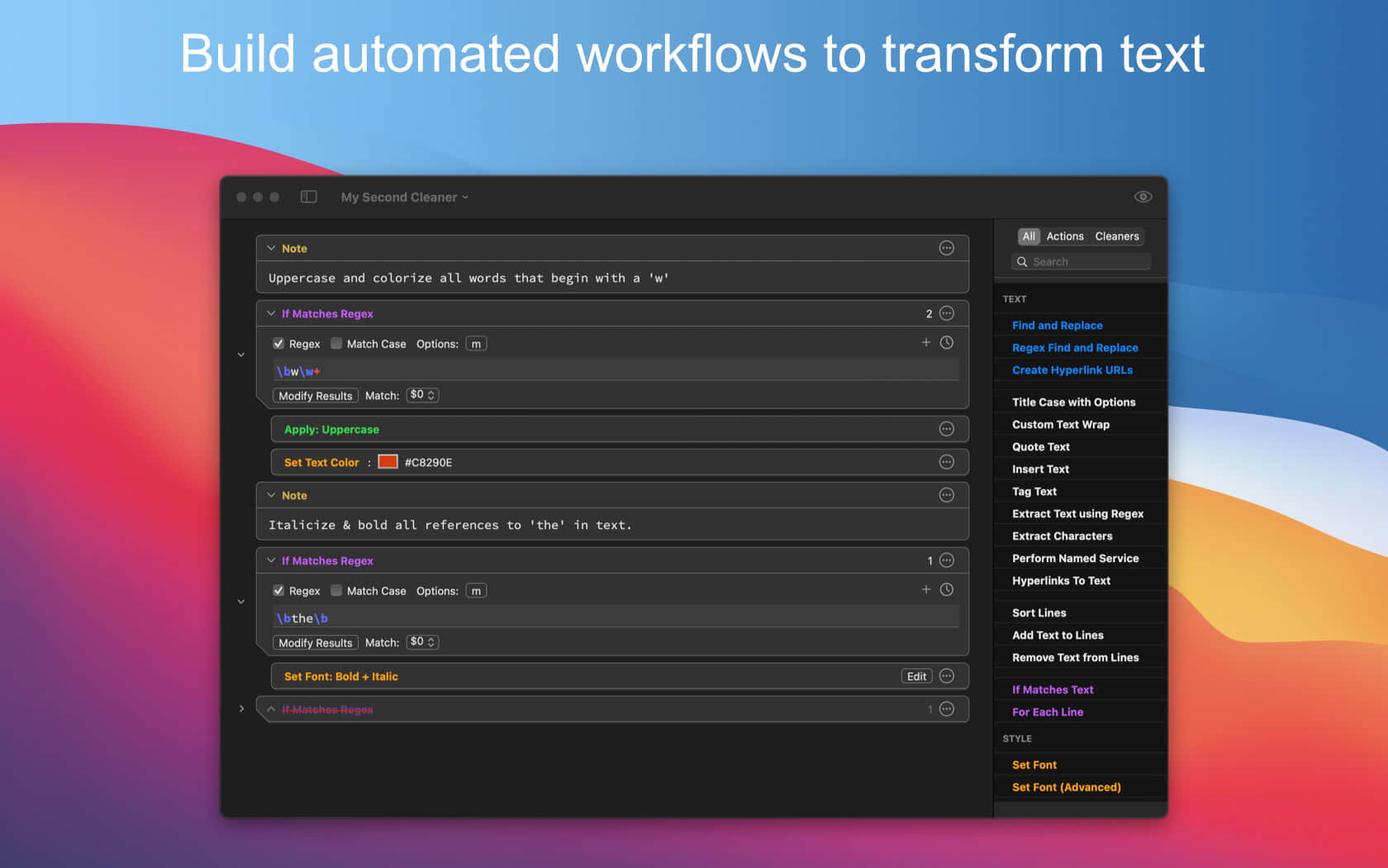 最新版的TextSoap 9配备了简约且现代化的界面,旨在让用户专注于处理文本内容或构建自定义的清洁工具。该软件支持macOS 10.15及更高版本,并且已经原生支持Apple Silicon芯片,确保了在最新Mac设备上的最佳性能。