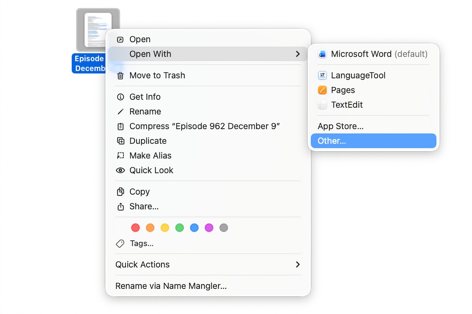 要为文件类型设置默认应用,请按住Control键点击文件并选择“其他”。