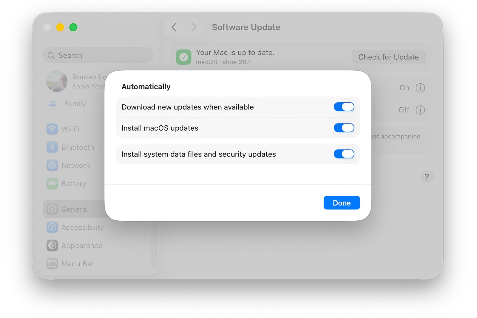要自动保持macOS更新,请转到“系统设置”>“通用”>“软件更新”。点击“自动更新”旁边的“i”按钮,确保所有开关都已打开,然后点击“完成”。