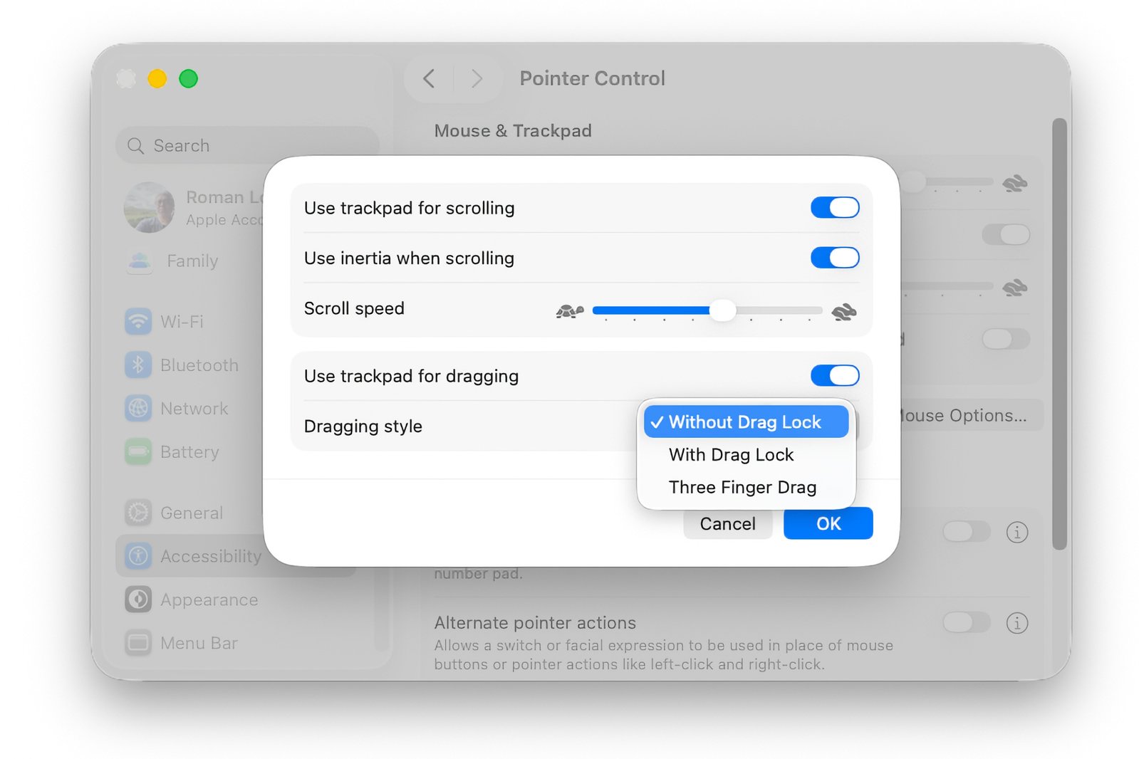 还有其他手势可以在其他地方启用,我最喜欢的一个可以通过转到“系统设置”>“辅助功能”>“指针控制”>“触控板选项”找到。在这里,启用“使用触控板进行拖移”并从下拉菜单中选择一个选项。这让你可以通过在触控板上双击文件并滑动,或使用三指轻扫来移动文件,这两种方式都比在移动物品时按住触控板要容易得多。