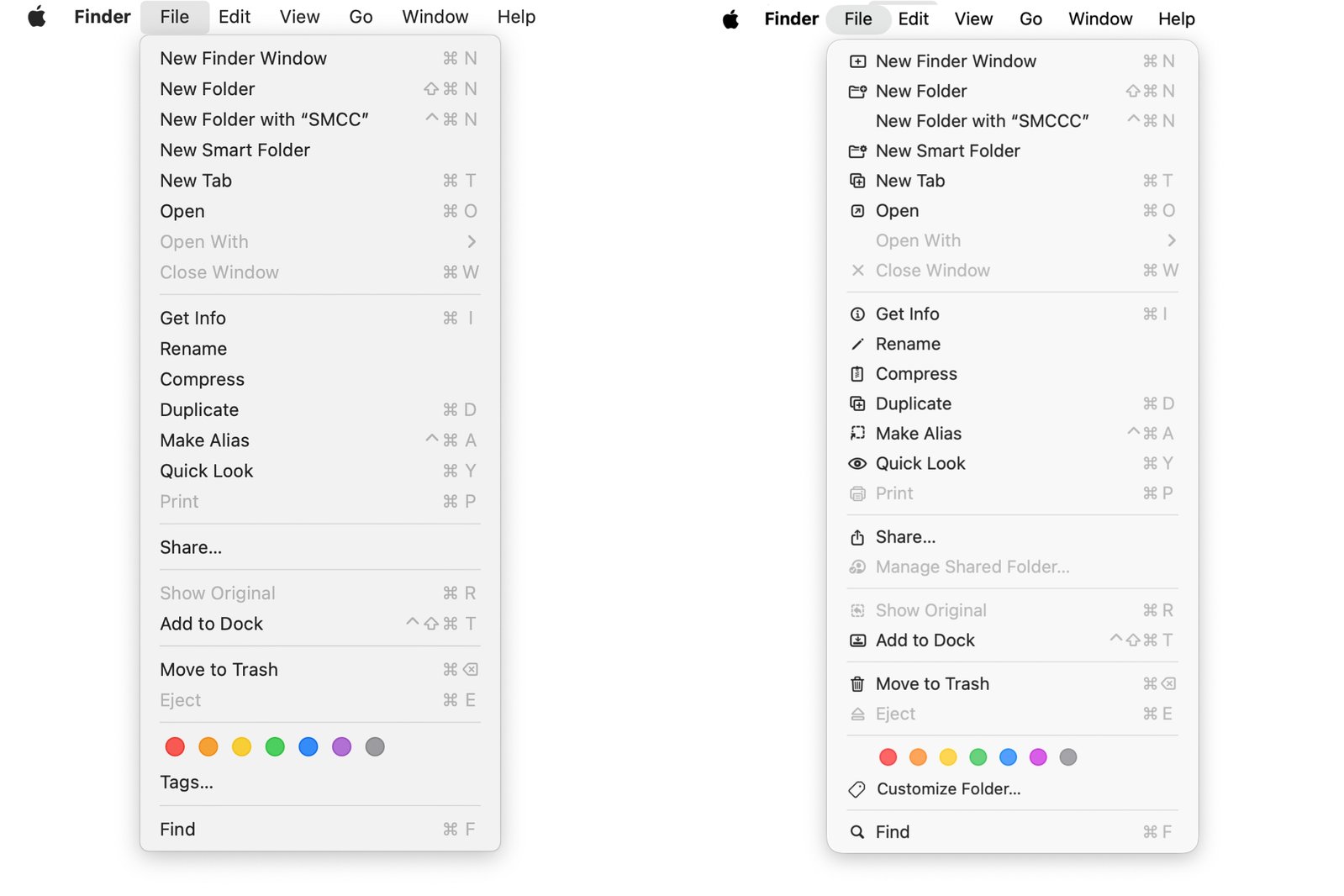 以下是Finder中“文件”菜单的示例。左侧是Tahoe之前的版本,右侧是Tahoe中的同一菜单。