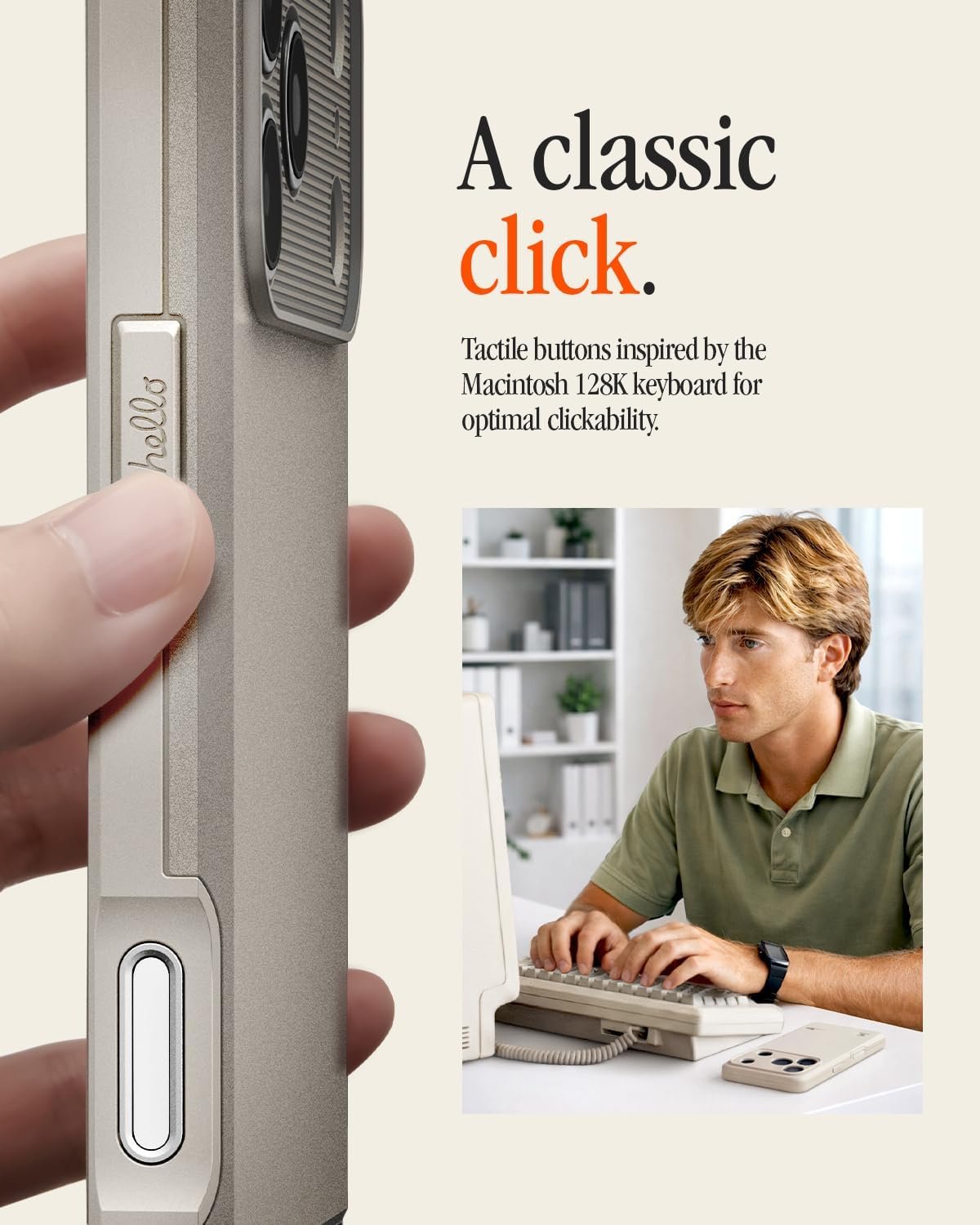 Spigen最新推出的Classic LS保护壳专为iPhone 17 Pro和17 Pro Max设计,目前已在亚马逊开售,仅需40美元。它采用了经典的哑光“石头色”配色(请不要说是米色!)搭配满满的时代细节。比如电源键上印有Macintosh界面标志性的草书“hello”,摄像头控制键下方还设计了一个让人想起80年代相机光圈的挂绳孔,就连logo也完美呼应了当年苹果的彩虹标志。