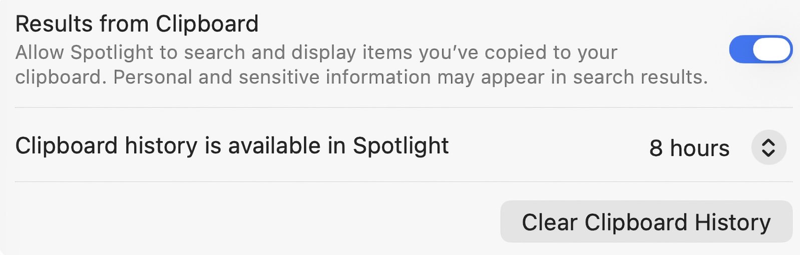 macOS Tahoe 26.1 新增Spotlight剪贴板管理设置,超级实用!