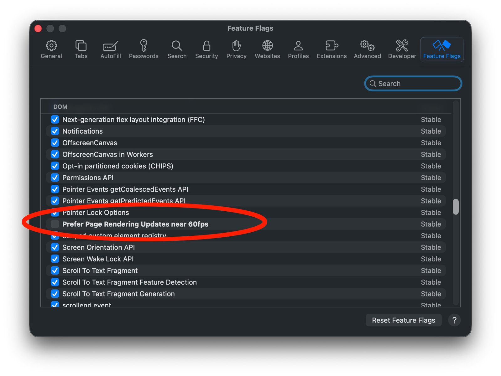 进入「功能旗标」标签页,向下滚动或直接使用搜索框输入关键词,找到「Prefer Page Rendering Updates near 60fps」,取消勾选该选项。完成后彻底退出Safari(包括菜单栏彻底关闭),再重新打开即可生效。