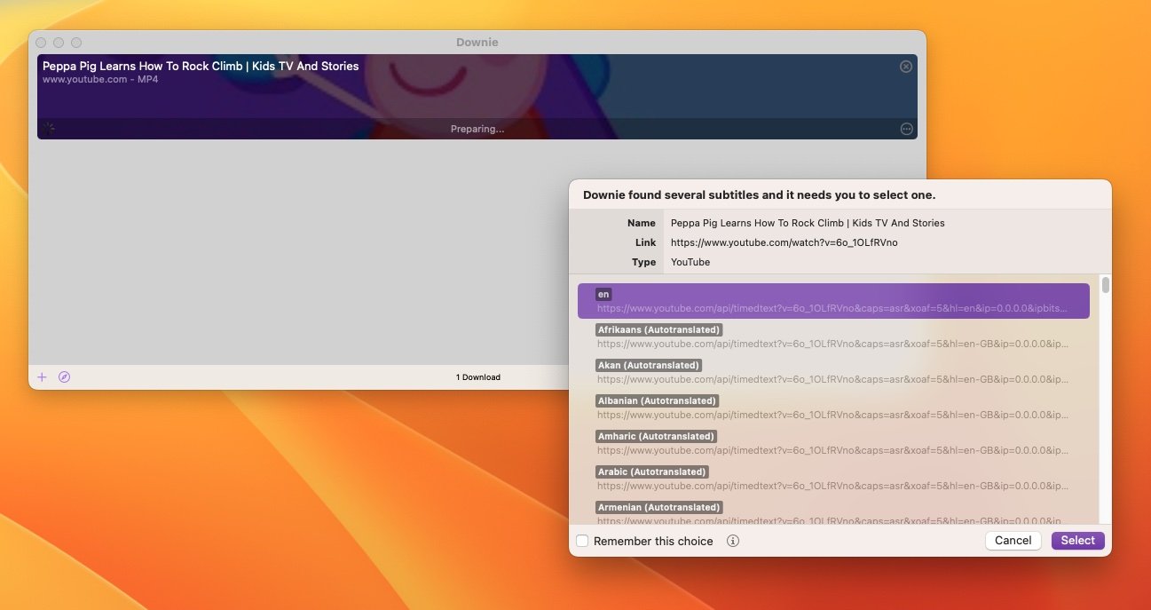 启动应用后可进行多种设置,例如始终下载最高画质、强制MP4格式、下载后自动处理等。Downie支持Firefox、Safari、Chrome浏览器扩展,也可直接把视频链接从浏览器拖到Dock上的Downie图标或下载窗口,甚至还能选择字幕。