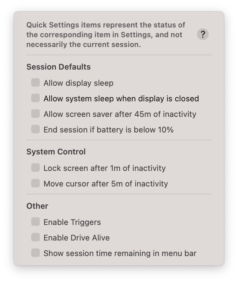 - 点击菜单栏 Amphetamine 图标 → Quick Settings