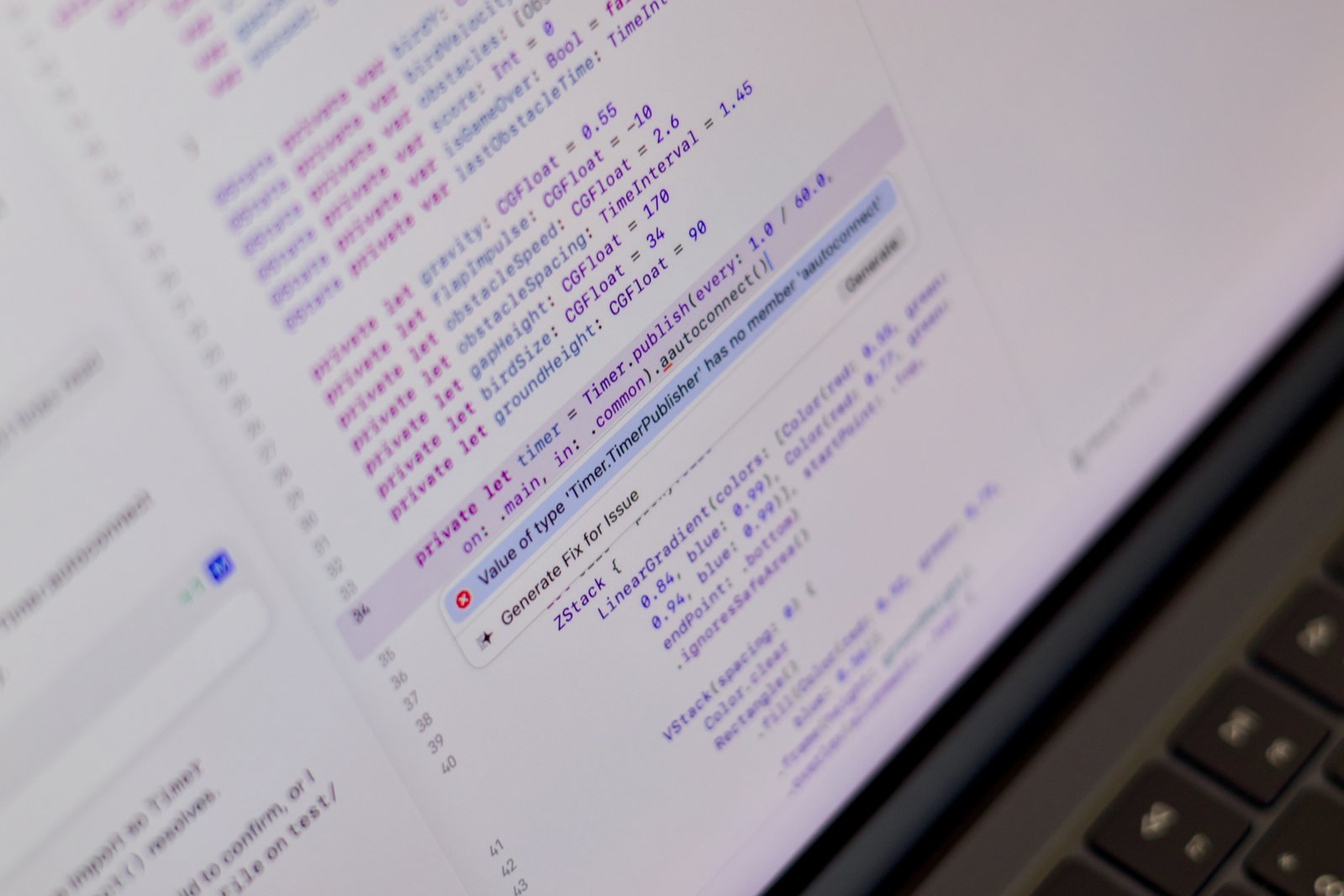 当然,AI第一次生成的代码果然报错了。我本可以花几分钟(甚至几小时)去读代码找问题,但现在这个“脑子摆烂”时代,谁还自己修bug啊?我直接点代码里的红色错误提示,然后点“Generate Fix for Issue”。Xcode立刻让AI代理扫描问题行,几秒钟后Codex就找出了原因并自动改好了代码。