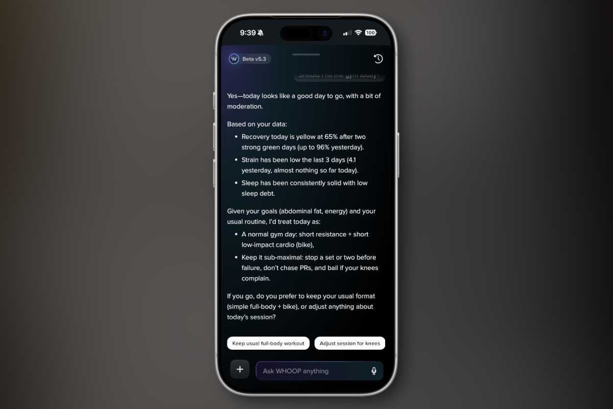 说到AI,Whoop对自己的AI健康教练挺自豪的,但其实就是个很一般的LLM聊天机器人。Whoop AI助理在5.3版本居然还在“beta”,典型的LLM毛病一堆。基本套路就是: