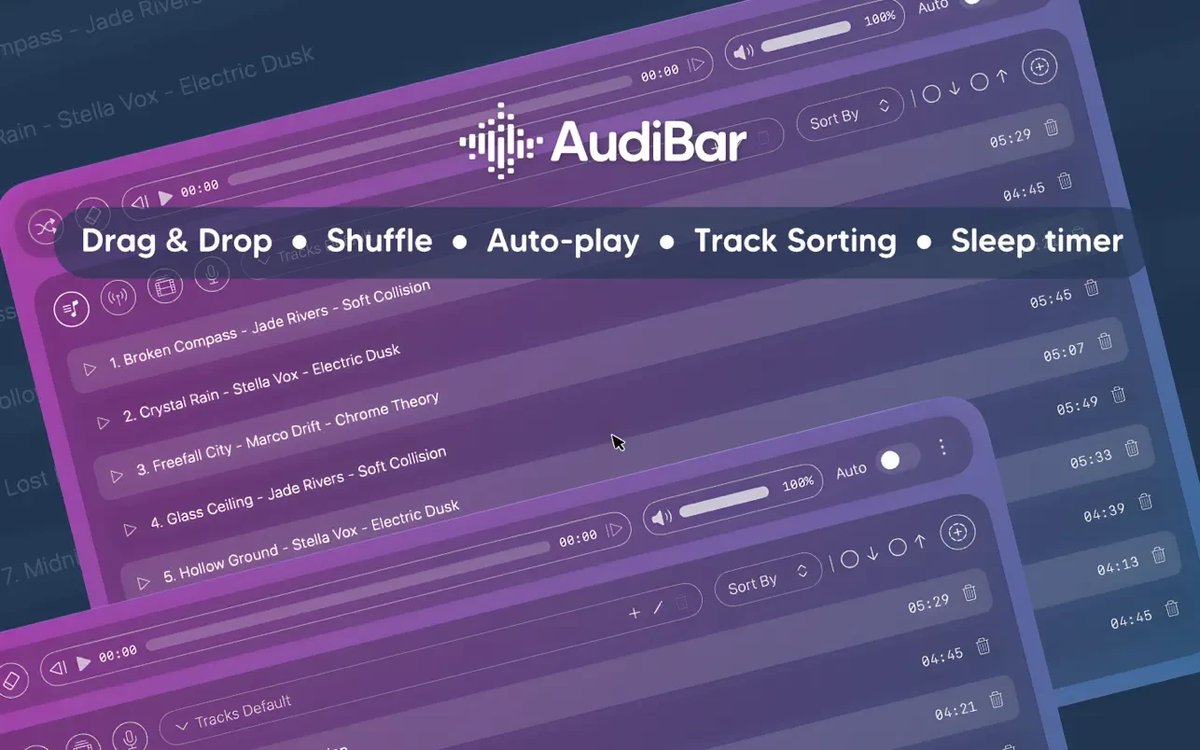 AudiBar是一款专为Mac打造的菜单栏音频播放器,核心就是把音频播放这件事变得超级简单直接。它不像那些需要建库、同步云端的重型音乐App,AudiBar就静静待在菜单栏里,你随时点开就能播放本地文件、听电台、刷YouTube音频或者追播客,完全零负担。拖拽几个MP3或者文件夹进去,马上就能听,支持几乎所有常见音频格式,还能从iCloud Drive直接拉取,播放时内存占用不到50MB,闲置时CPU零占用,笔记本用一整天也省电。