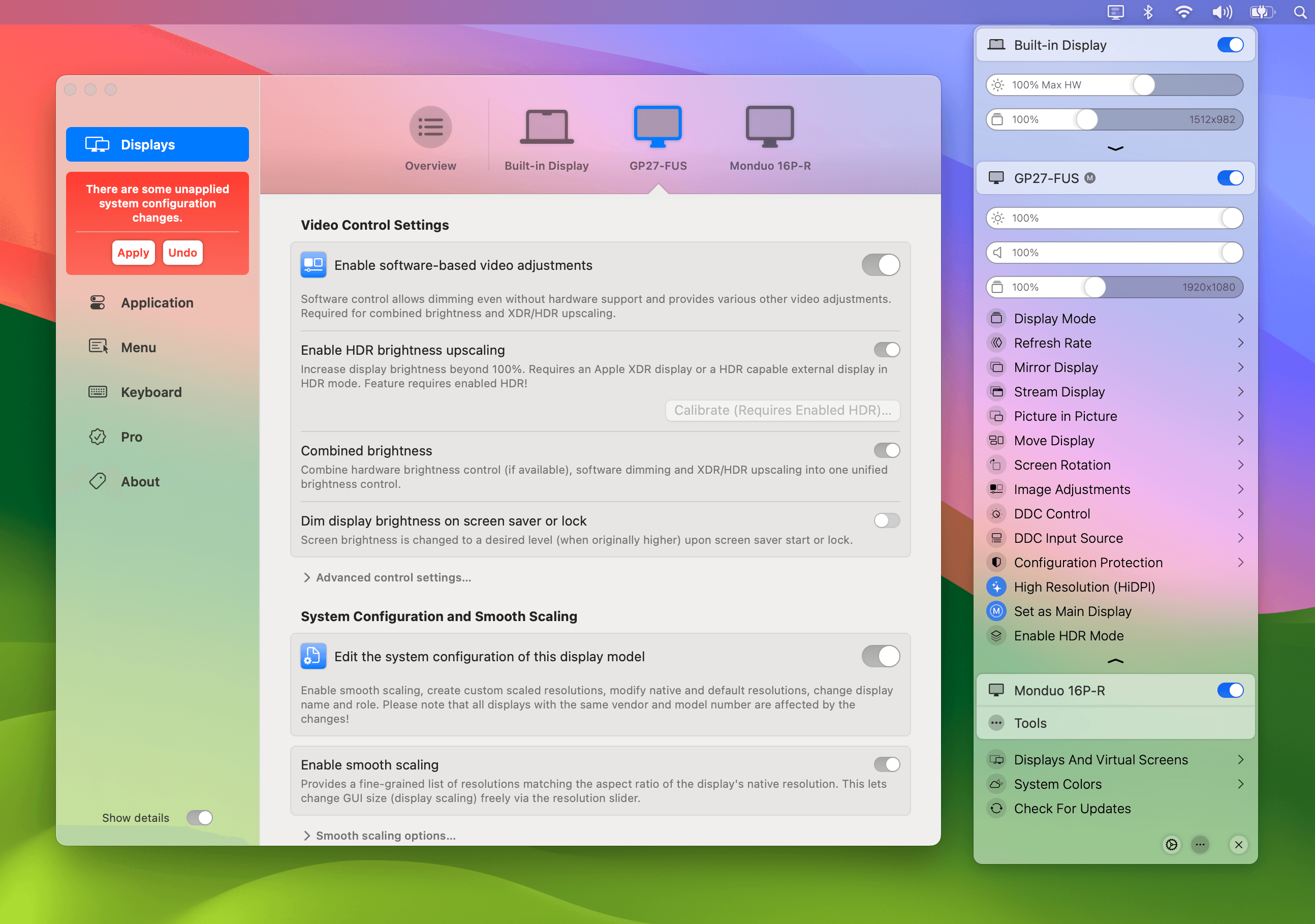 BetterDisplay Pro 是一个很棒的Mac显示器管理设置工具,BetterDisplay Pro可以让您将显示器转换为完全可扩展的屏幕、管理显示器配置覆盖、允许亮度和颜色控制、提供XDR/HDR 亮度升级(与 Apple Silicon Mac 兼容的显示器的额外亮度超过 100%)、完全调暗至黑色,帮助您为您的 Mac创建和管理虚拟屏幕,创建显示器的画中画窗口,并为您提供许多其他功能,以便您从菜单栏轻松管理显示器的设置。BetterDisplay Pro甚至可以即时断开/重新连接显示器!