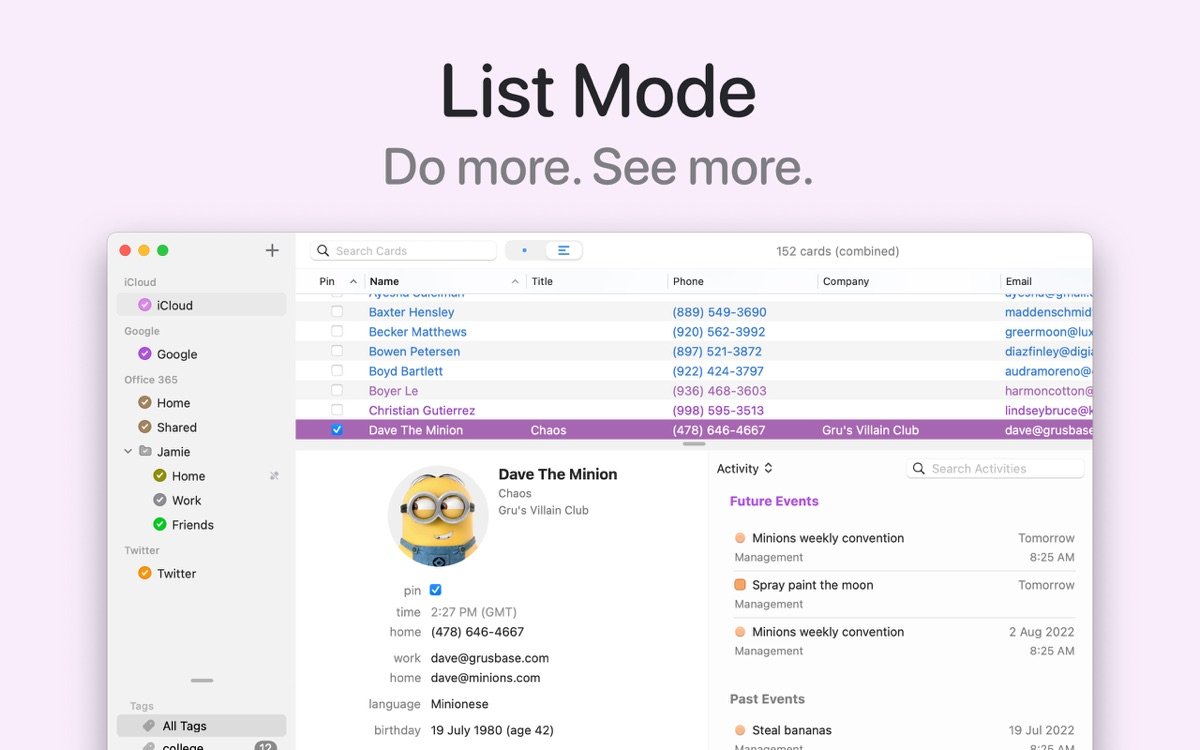 BusyContacts for Mac 是一款专为专业人士设计的联系人管理应用,它超越了苹果自带联系人工具的局限,提供更高效的组织和搜索体验。通过智能标签和自定义视图,用户可以轻松分类联系人,如家人客户或同事,并快速查看相关活动历史,包括邮件会议和任务。这款软件强调无缝集成,支持多种云服务同步,确保数据随时更新,帮助用户构建可靠的联系人网络,提升日常工作流畅度。无论是个人使用还是团队协作,BusyContacts 都能简化联系人管理过程,让信息检索变得直观便捷。