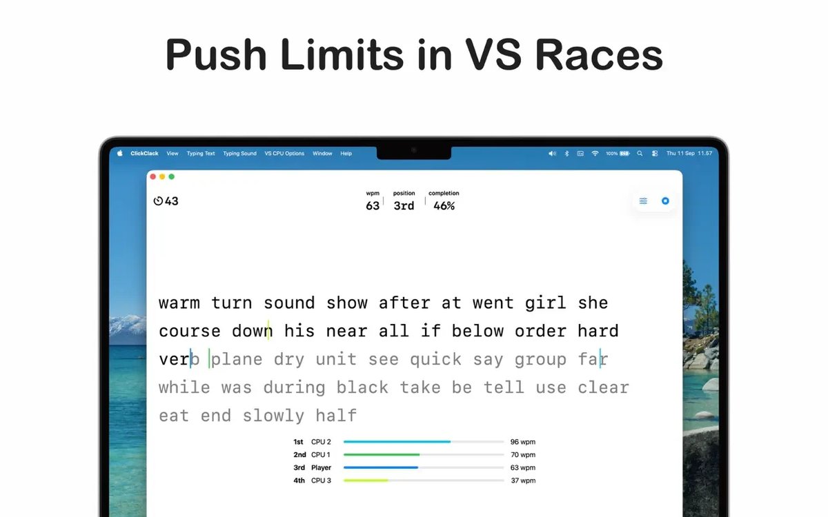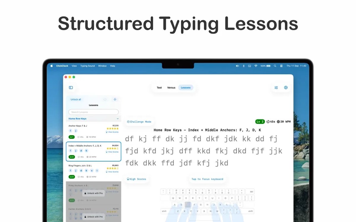 ClickClack for Mac 是一款专注于打字技能提升的训练应用,专为Mac用户设计。它以简洁无干扰的界面为核心,提供从入门指法到专业速度测试的全方位练习,帮助用户快速掌握盲打技巧并显著提高输入效率。无论您是学生、上班族还是游戏爱好者,这款应用都能通过个性化设置和数据分析,让打字成为一种享受而非负担。支持多语言输入,包括中文,并兼容各种键盘布局,确保全球用户都能轻松上手。