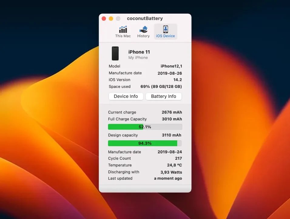 coconutBattery for Mac 是一款专注于电池健康监测的实用软件,它能够为用户提供Mac电脑、iPhone和iPad等苹果设备的电池详细信息。通过直观的界面,用户可以轻松查看当前电池容量、充电次数、温度变化以及健康百分比,帮助及时发现潜在问题并采取优化措施。这款软件特别适合注重设备维护的用户,在日常使用中提升电池管理效率,确保电池健康状态始终处于最佳水平。作为电池监测领域的经典工具,coconutBattery 强调准确性和便捷性,支持无线连接查看iOS设备数据,避免了传统USB连接的麻烦。