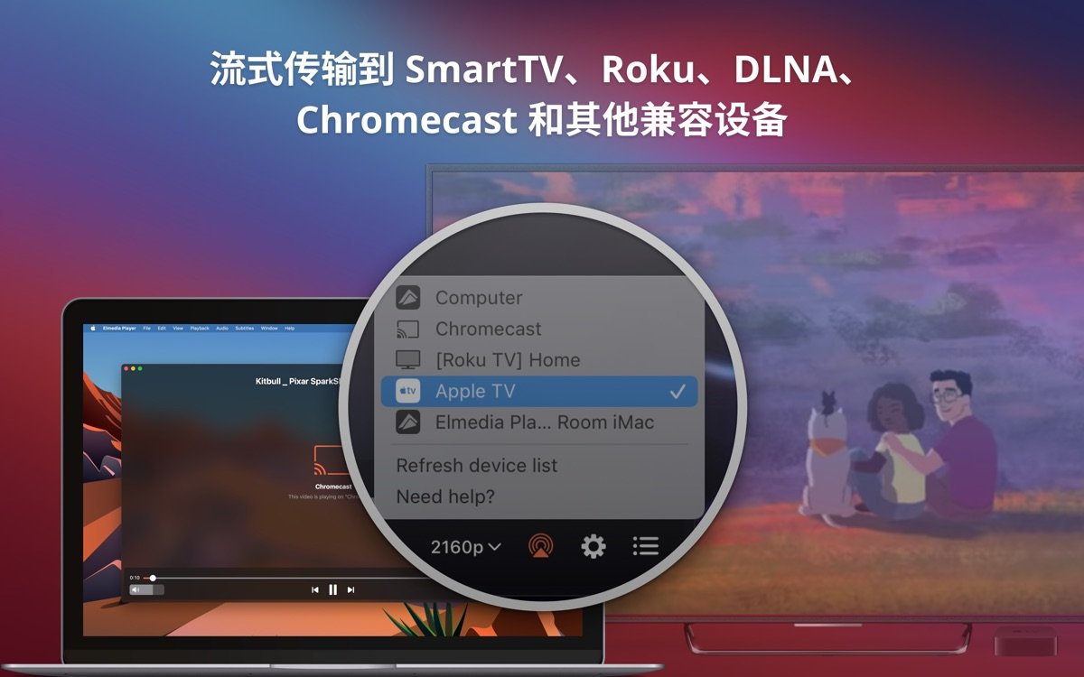 2. 无线流媒体:轻松投屏至 Chromecast、Apple TV、DLNA 智能电视或 Roku 设备,支持 4K 视频实时转码和字幕同步。