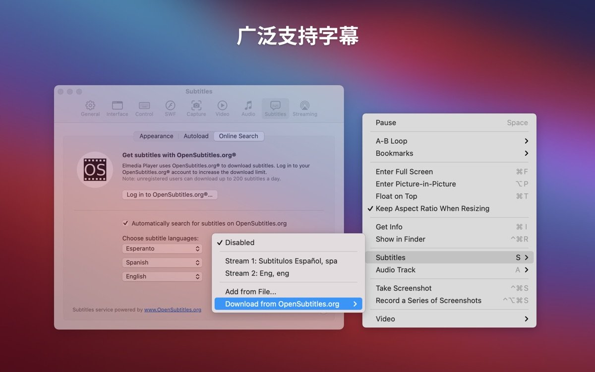 3. 字幕管理:内置 OpenSubtitles 搜索,自动加载并同步 SRT、ASS 等字幕文件,可调整位置、字体和颜色。