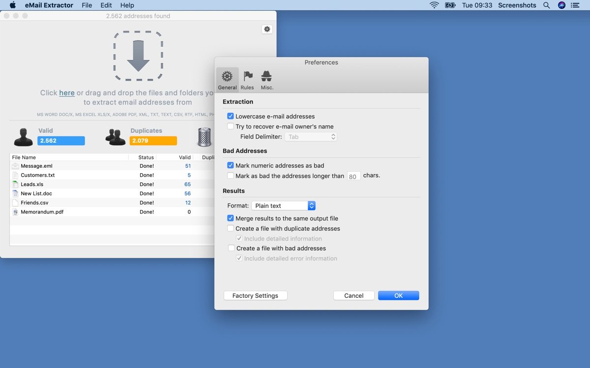 eMail Extractor for Mac 这款软件真是Mac用户提取邮箱地址的得力助手。它能从各种文本来源里把有效邮件地址一个个揪出来,不管是本地文件还是直接拖进剪贴板的内容,都处理得又快又准。很多人在做邮件营销或者整理客户资料的时候,都靠它省了不少功夫。支持的文件类型特别多,从普通TXT到PDF、Word文档、Excel表格,甚至HTML网页、邮箱存档MBOX和EML文件、SQL数据库还有RTF格式,几乎覆盖了日常能遇到的所有情况。软件运行起来多线程,速度飞快,提取完还会自动去重,把无效的假地址也聪明地剔除掉,最后输出一个格式整齐的干净列表。