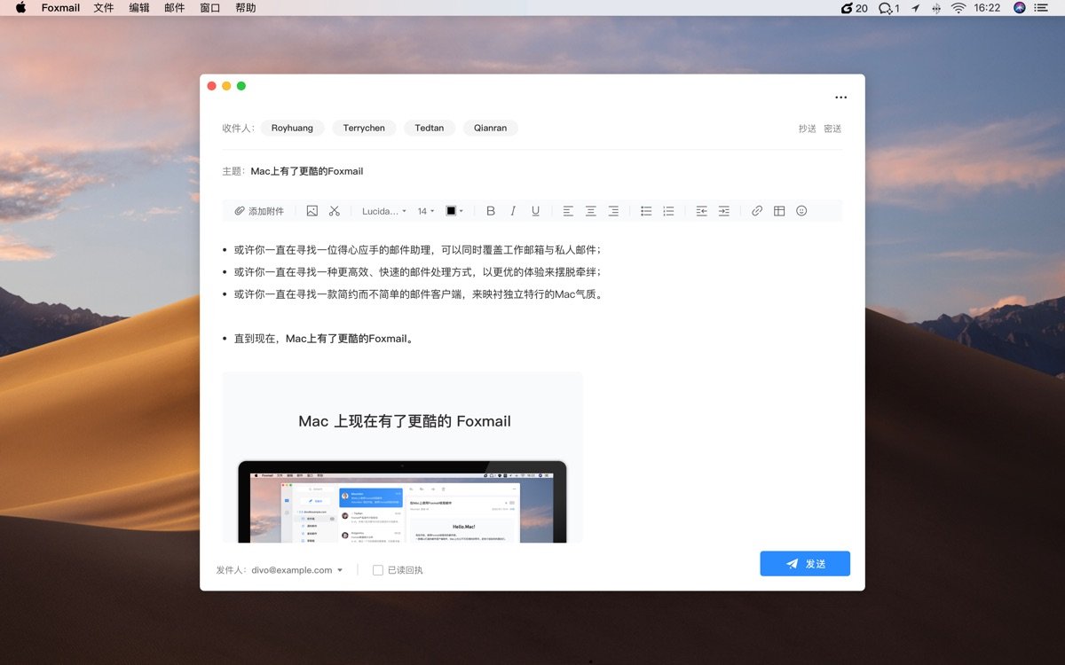 Foxmail for Mac 是腾讯推出的一款专为苹果电脑量身打造的邮件客户端。界面经过全新设计,看起来干净清爽,用起来特别顺手。很多Mac用户都觉得它比传统邮箱客户端更贴心,尤其是针对办公场景优化了Exchange协议支持,配置起来几乎不用手动折腾。超大附件发送功能也让分享大文件变得轻松不少,企业邮箱用户还能享受到专属的地址簿和快速登录体验。整体来说,它不是那种功能堆砌的工具,而是真正帮你把邮件这件事变简单的助手。