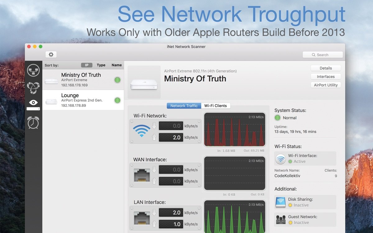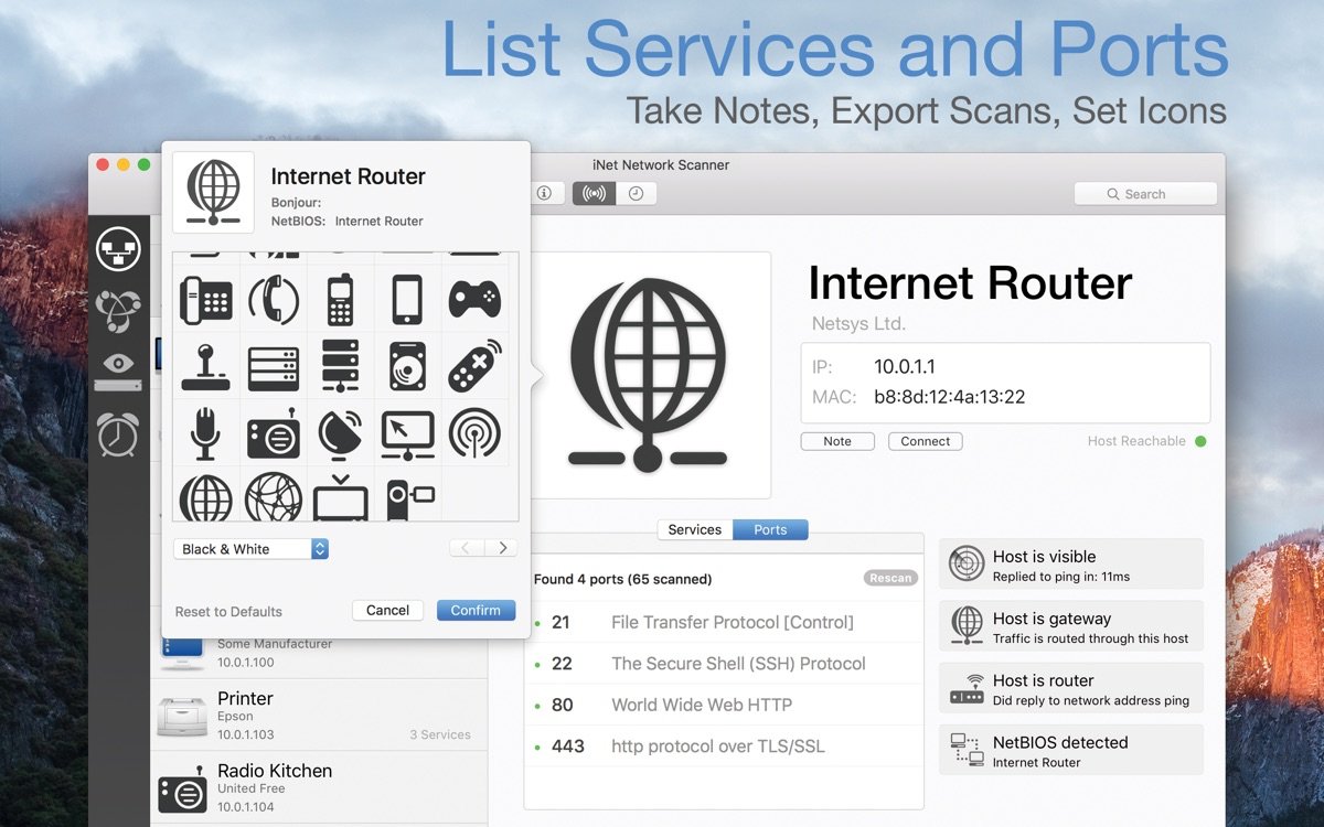 iNet Network Scanner for Mac 是一款强大的网络扫描和监控应用,专为Mac用户设计,帮助您全面了解局域网环境。通过直观的界面,您可以快速扫描网络设备,识别连接的电脑、智能设备和路由器等,确保网络安全无虞。这款网络扫描工具支持实时显示设备IP地址、MAC地址和运行服务,让网络管理变得简单高效。无论是家庭用户还是专业网络管理员,都能从中受益,提升网络监控水平,避免潜在风险。iNet Network Scanner 强调隐私保护,不收集用户数据,一次购买即可享受所有更新,适用于各种网络扫描场景。